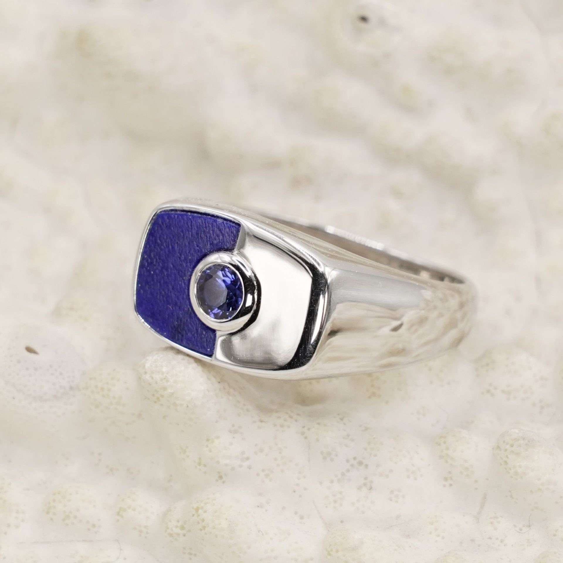 Bague en argent massif 925 rhodié, composée d’un insert en lapis lazuli, pierre naturelle d’un bleu profond, taillée sur mesure et intégrée directement dans le métal.
