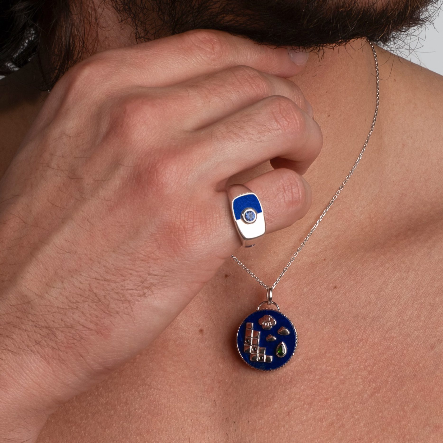 Au centre, un saphir de laboratoire est serti, apportant un point de lumière précis qui contraste avec la densité du lapis lazuli.