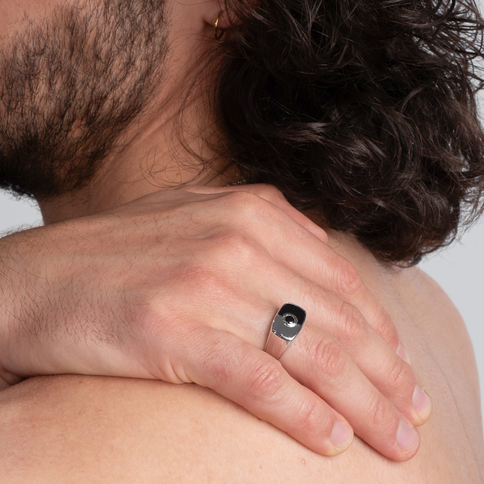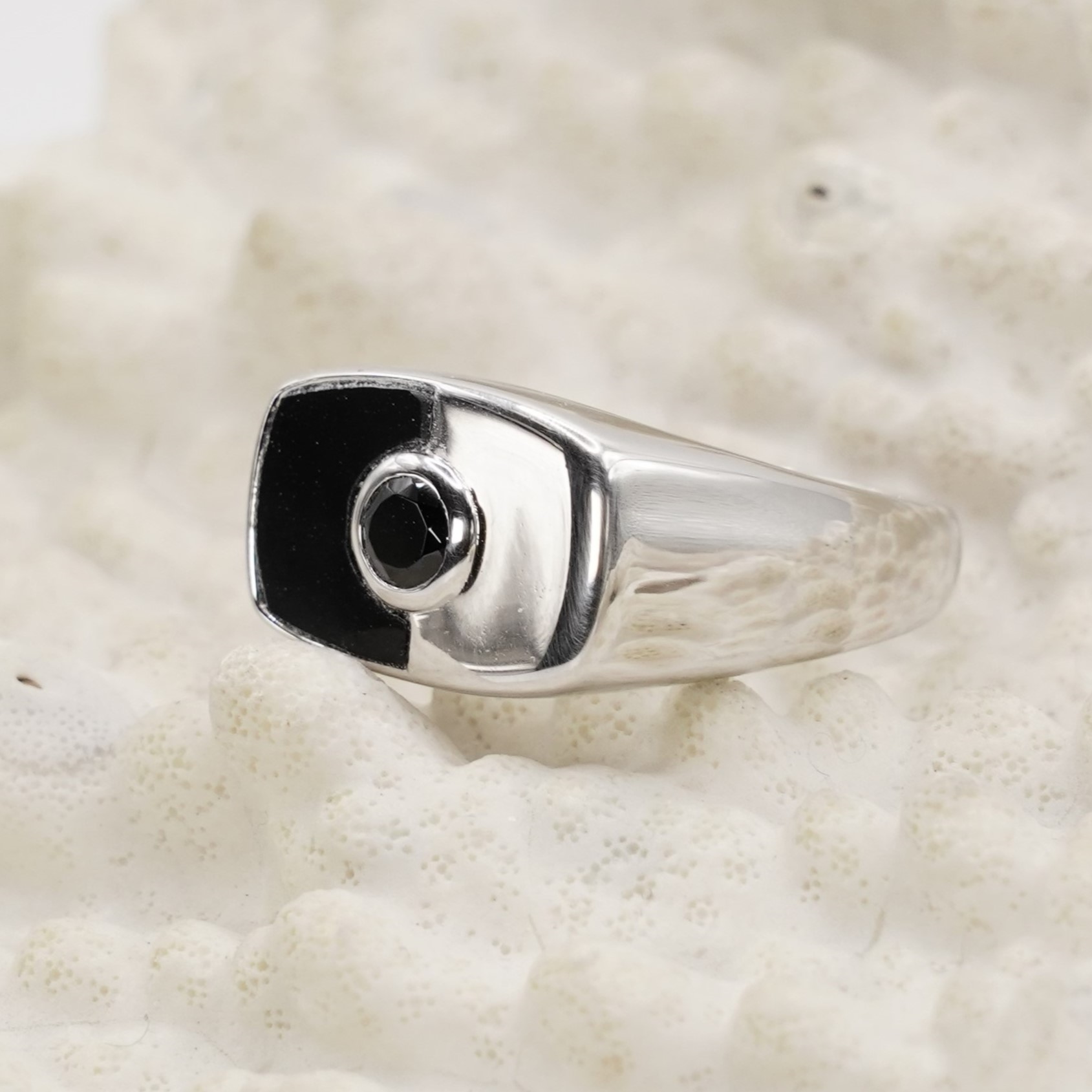Bague en argent massif 925 rhodié, composée d’un insert en onyx noir, pierre naturelle à l’aspect profond et uniforme, taillée sur mesure et intégrée directement dans le métal.