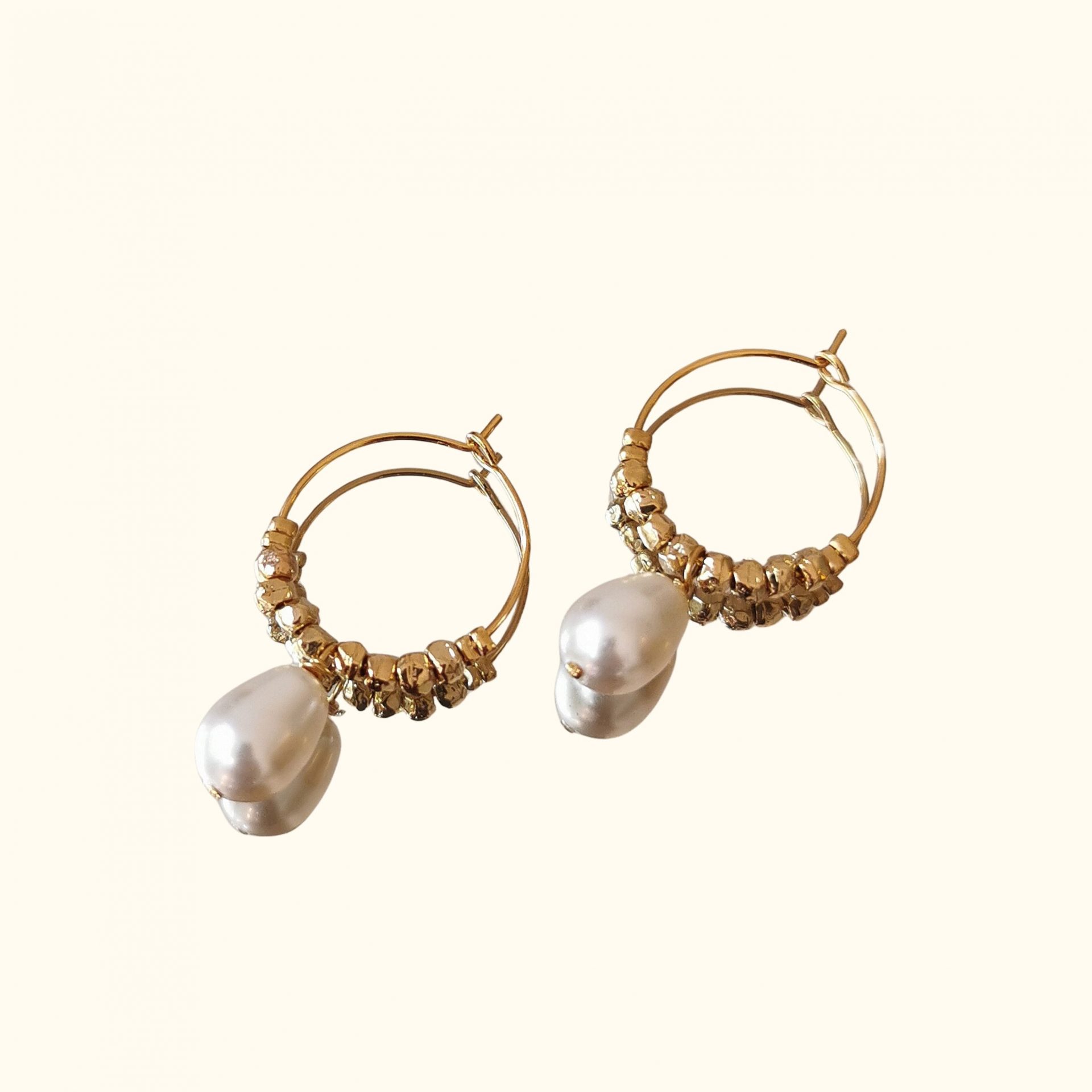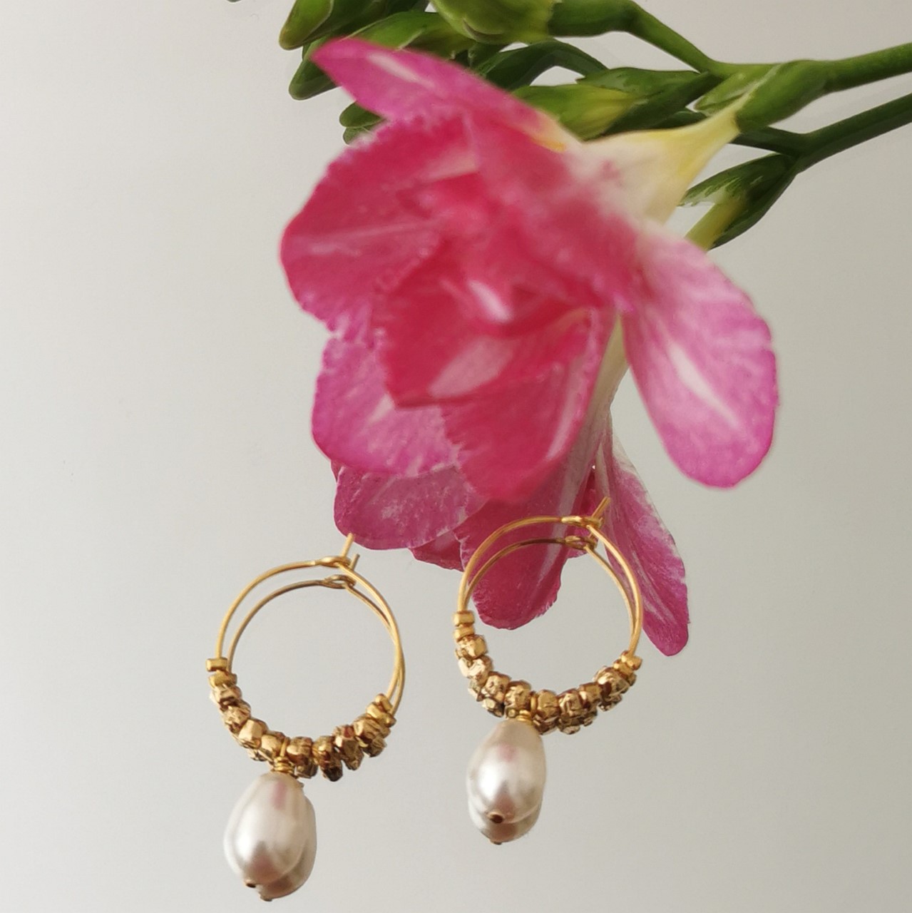 Petites créoles composées de perles dorées & d’une goutte Swarovski