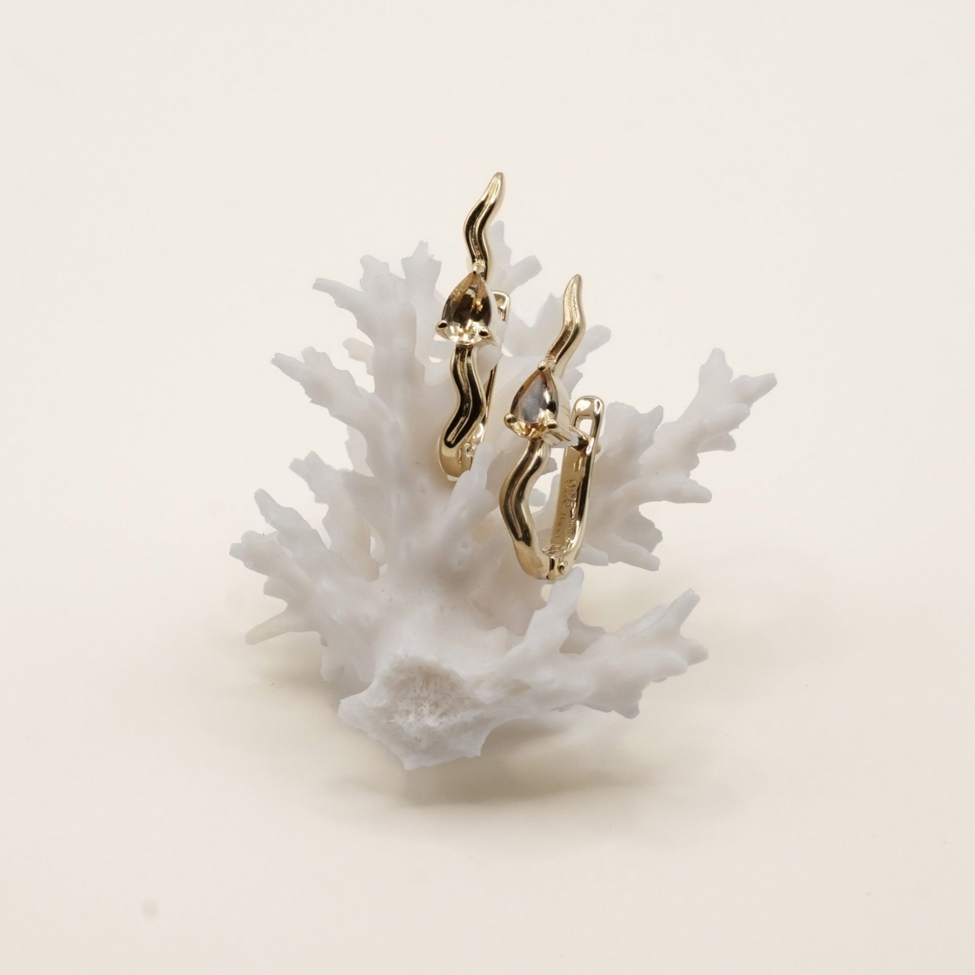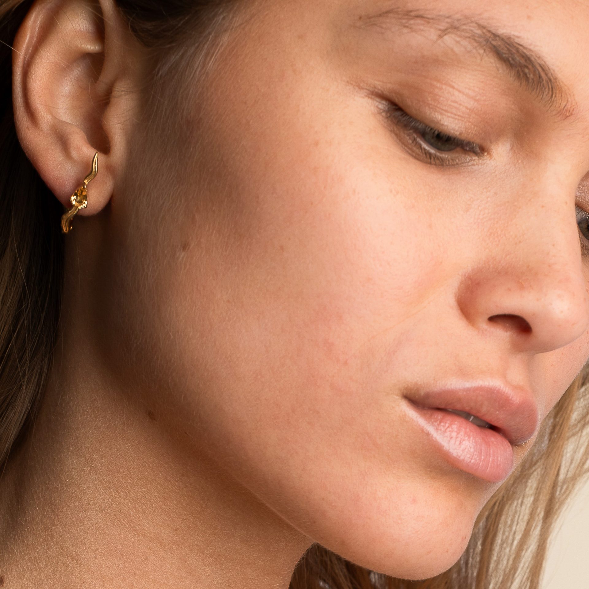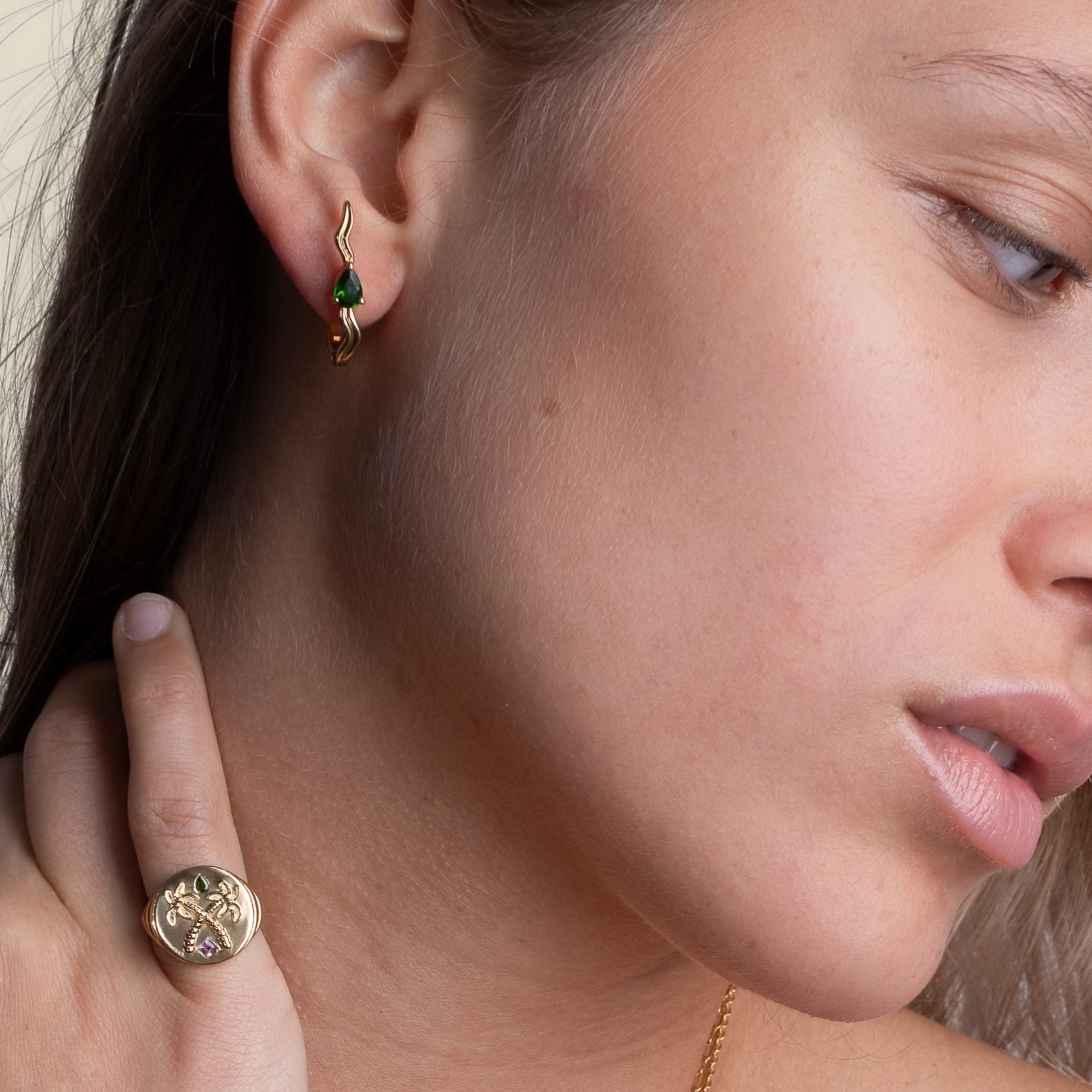 En leur centre, une pierre taillée en goutte vient capter la lumière et souligner la fluidité du métal, apportant éclat et relief à la silhouette.