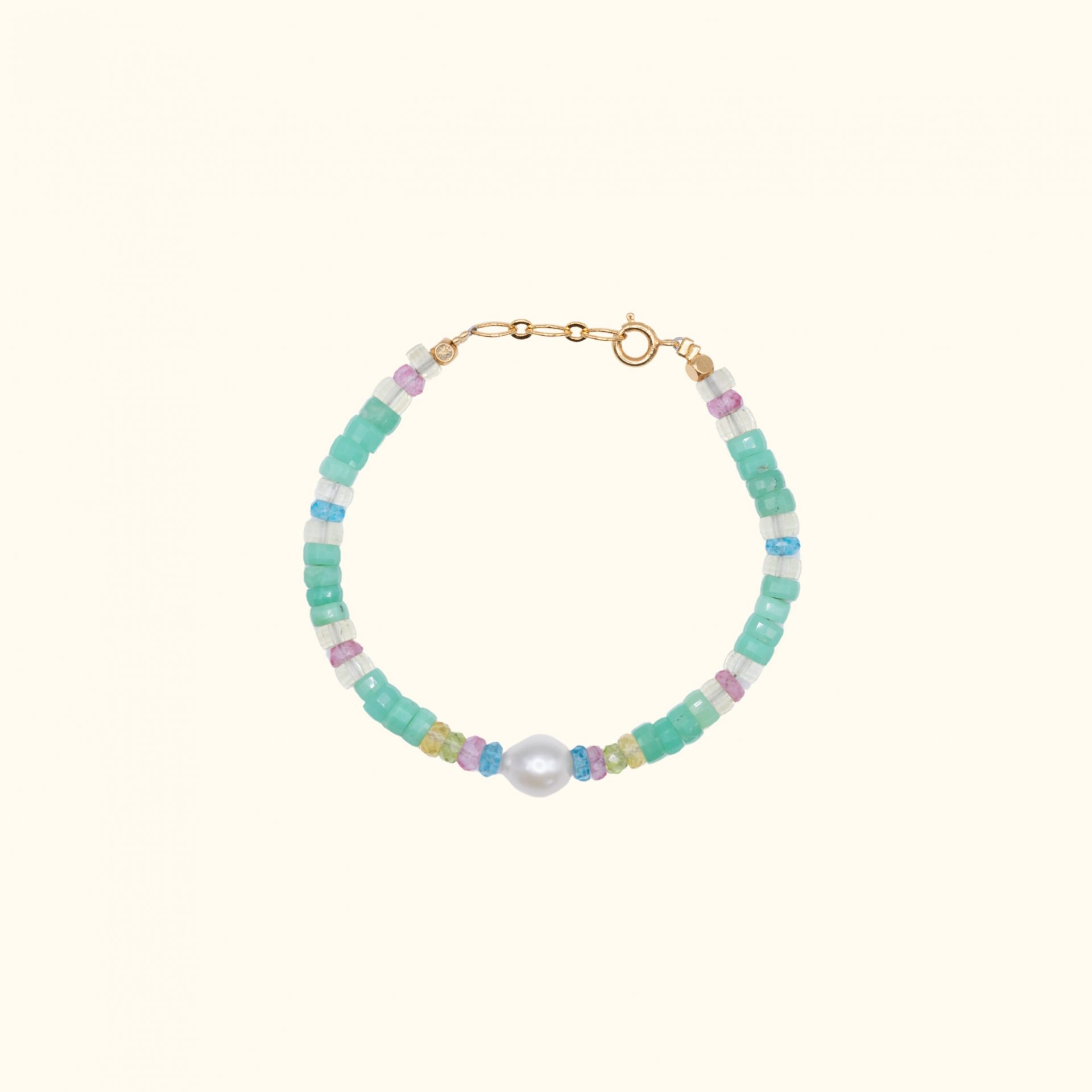 Bracelet composé de chrysoprase avec une touche de topaze rose et bleu, lemon quart & péridot.