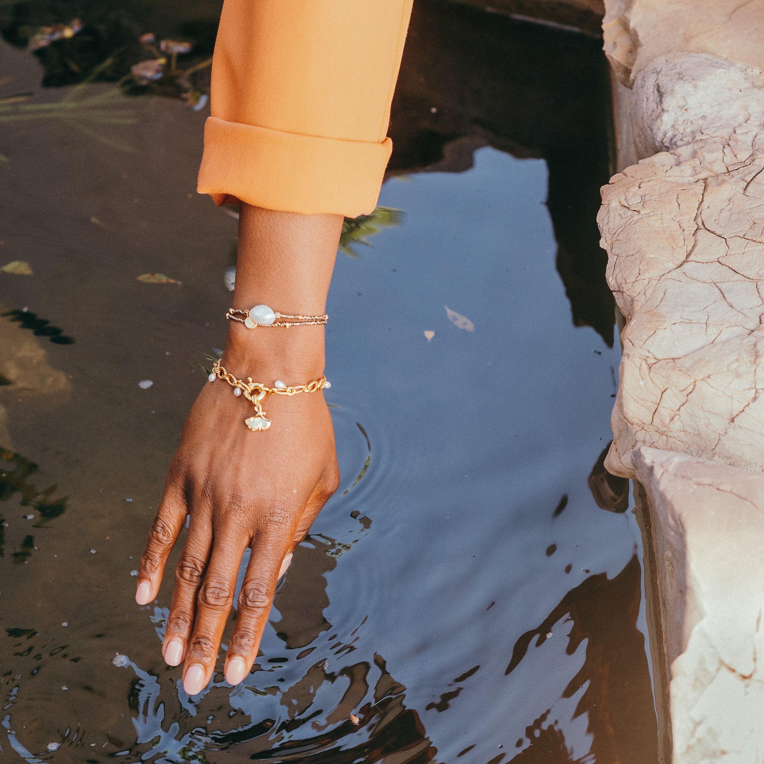 L’appellation « Colombe » fait référence à la pureté et l’élégance de la perle de culture placée au centre du bracelet. Celle-ci est entourée de perles dorées en forme de fleur.