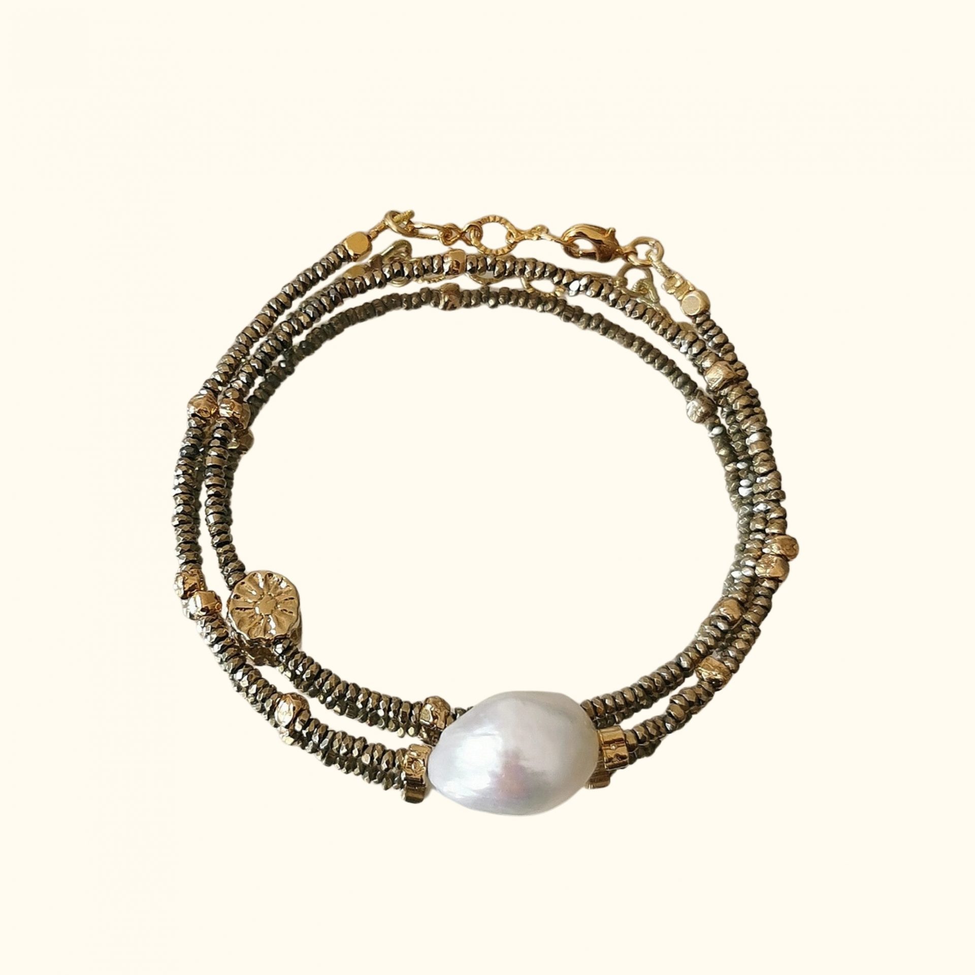 Bracelet composé d’hématites, de perles & d’une marguerite, dorées à l’or fin.