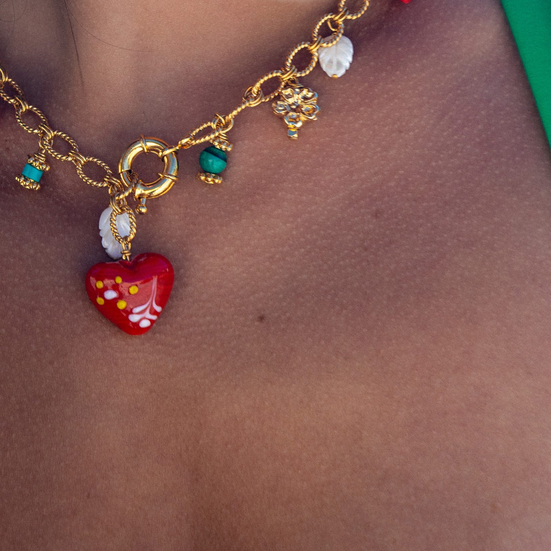 Collier fait à la main orné de multiples Grigri en pierres semi-précieuses, au centre un pendentif indien cœur rouge en verre très original.