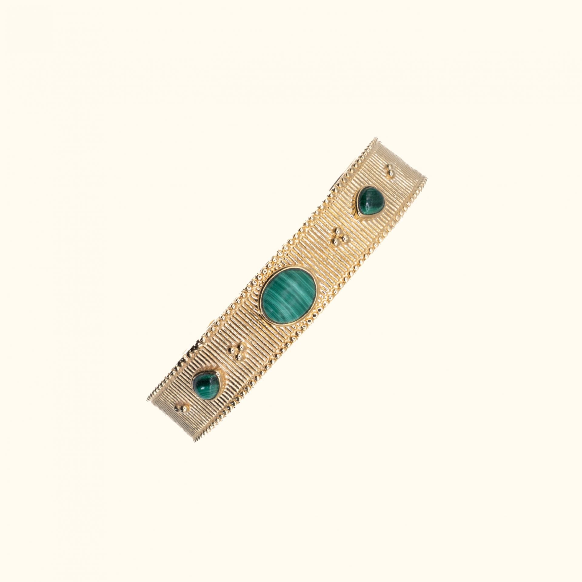 Au centre cabochon et gouttes en malachite entourés de petites granules.