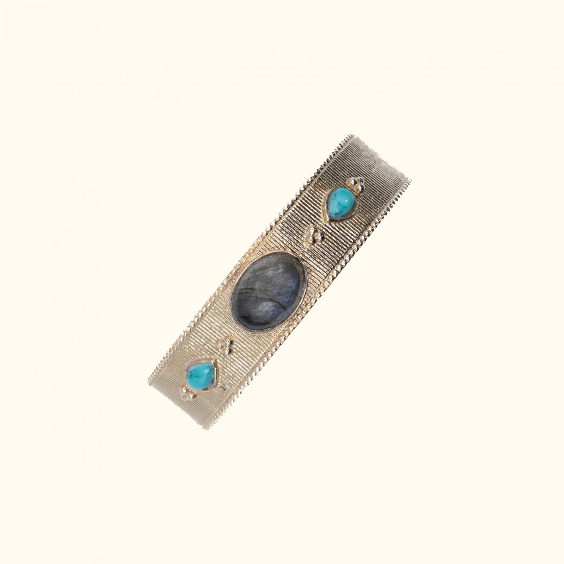 Au centre cabochon en labradorite & gouttes en véritable turquoise.