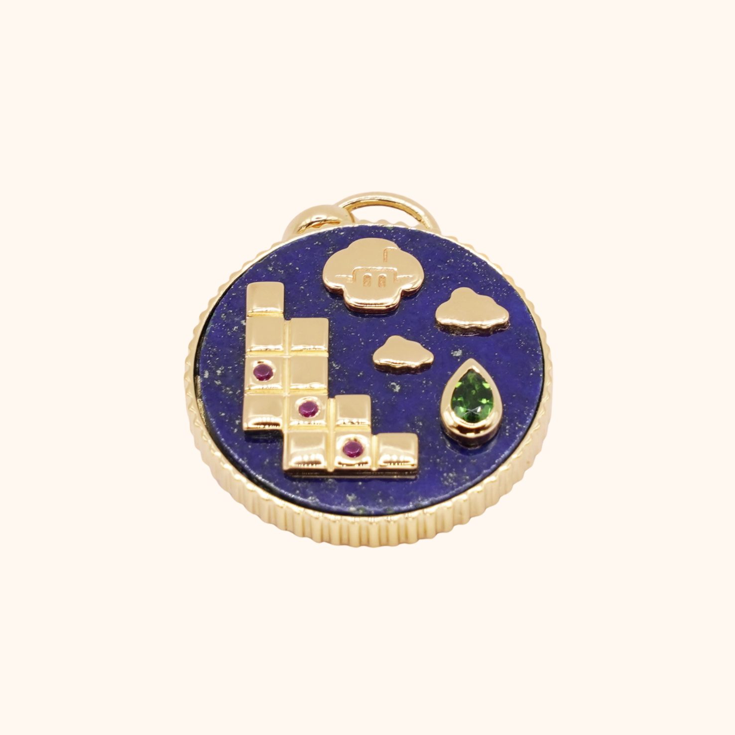 La médaille 8-Bit est réalisée en argent massif 925 plaqué or 3 microns, ornée d’un fond en lapis lazuli, pierre profonde aux reflets intenses, accompagnée de rubis et d’une goutte en diopside, dont les nuances vertes apportent contraste et lumière.