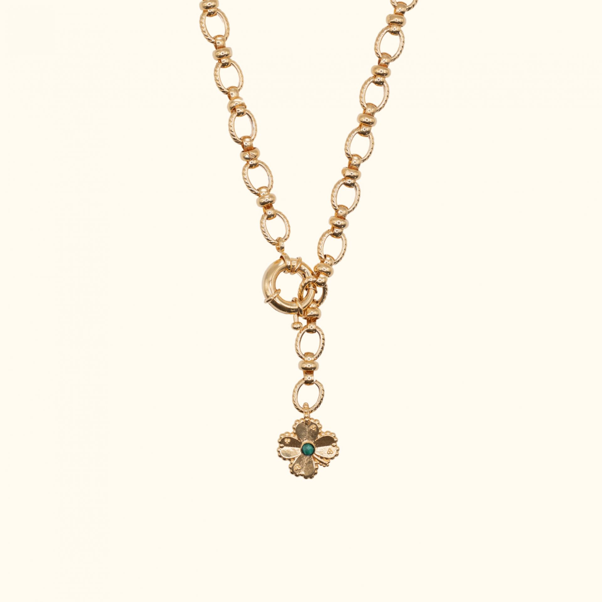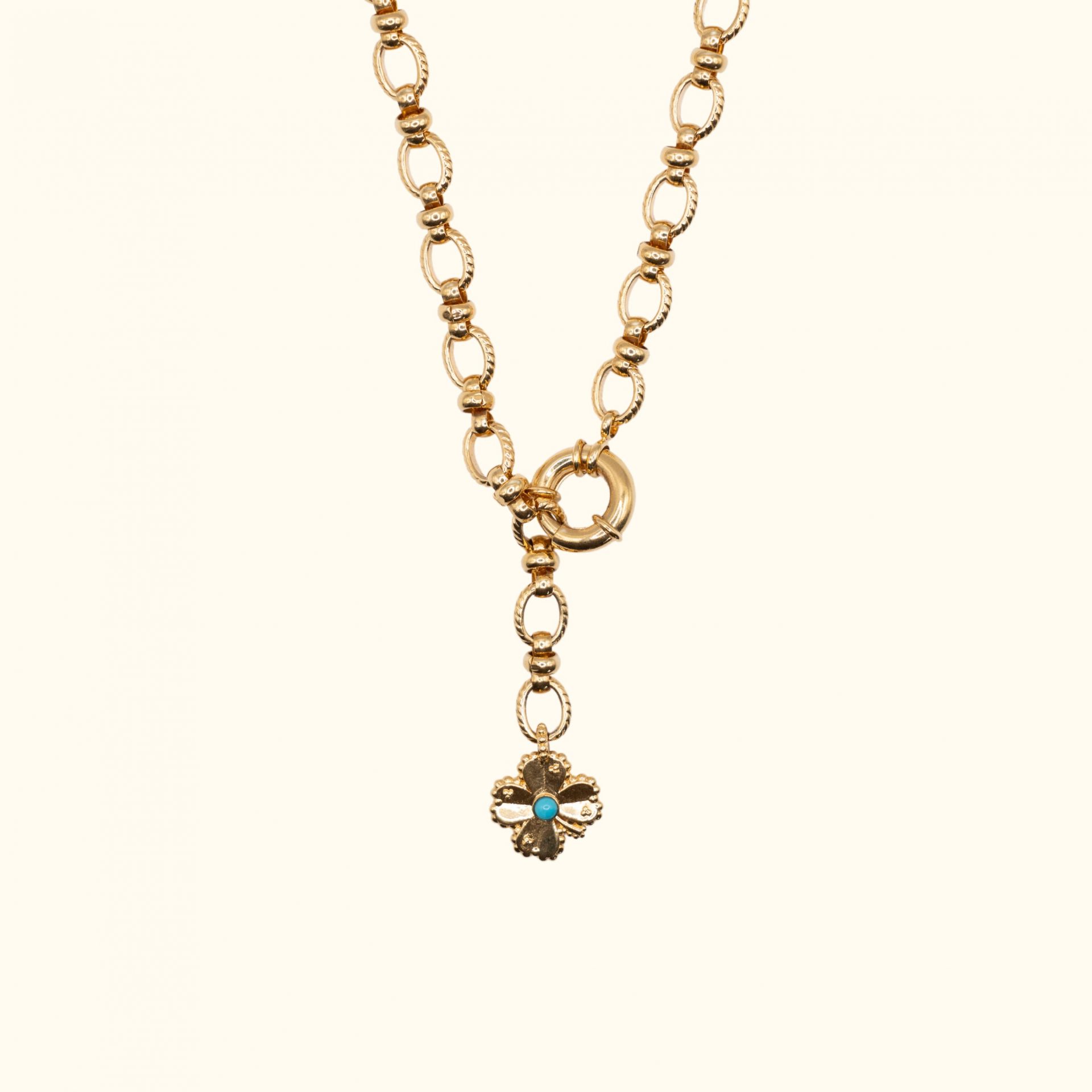 Collier composée d’une chaine à gros maillons, dorée à l’or fin et d’un pendentif trèfle double face.