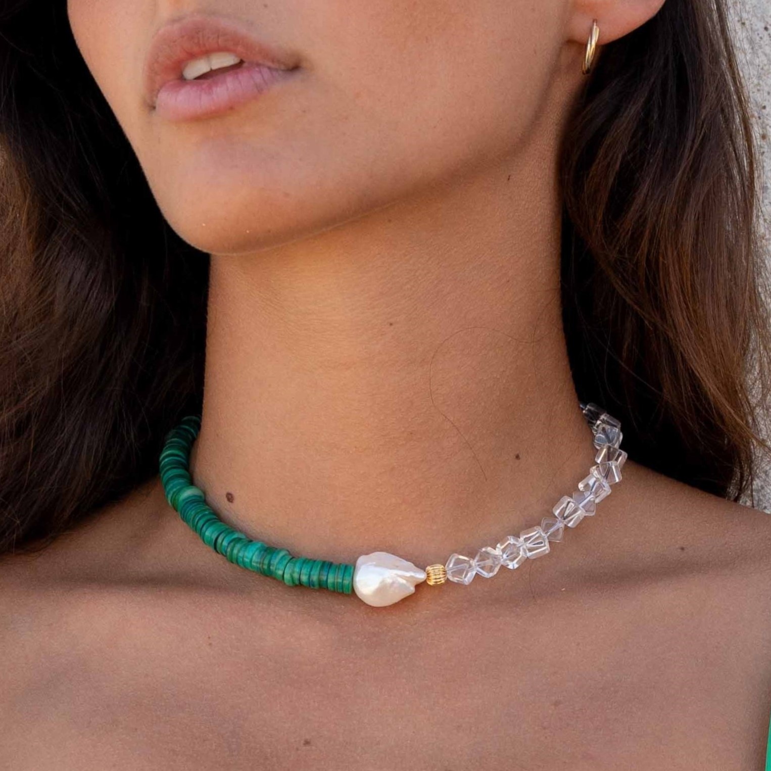 Toute l’originalité de ce collier tient au mélange de cristal de roche sous forme de petits cubes et de coquillage heishi vert.