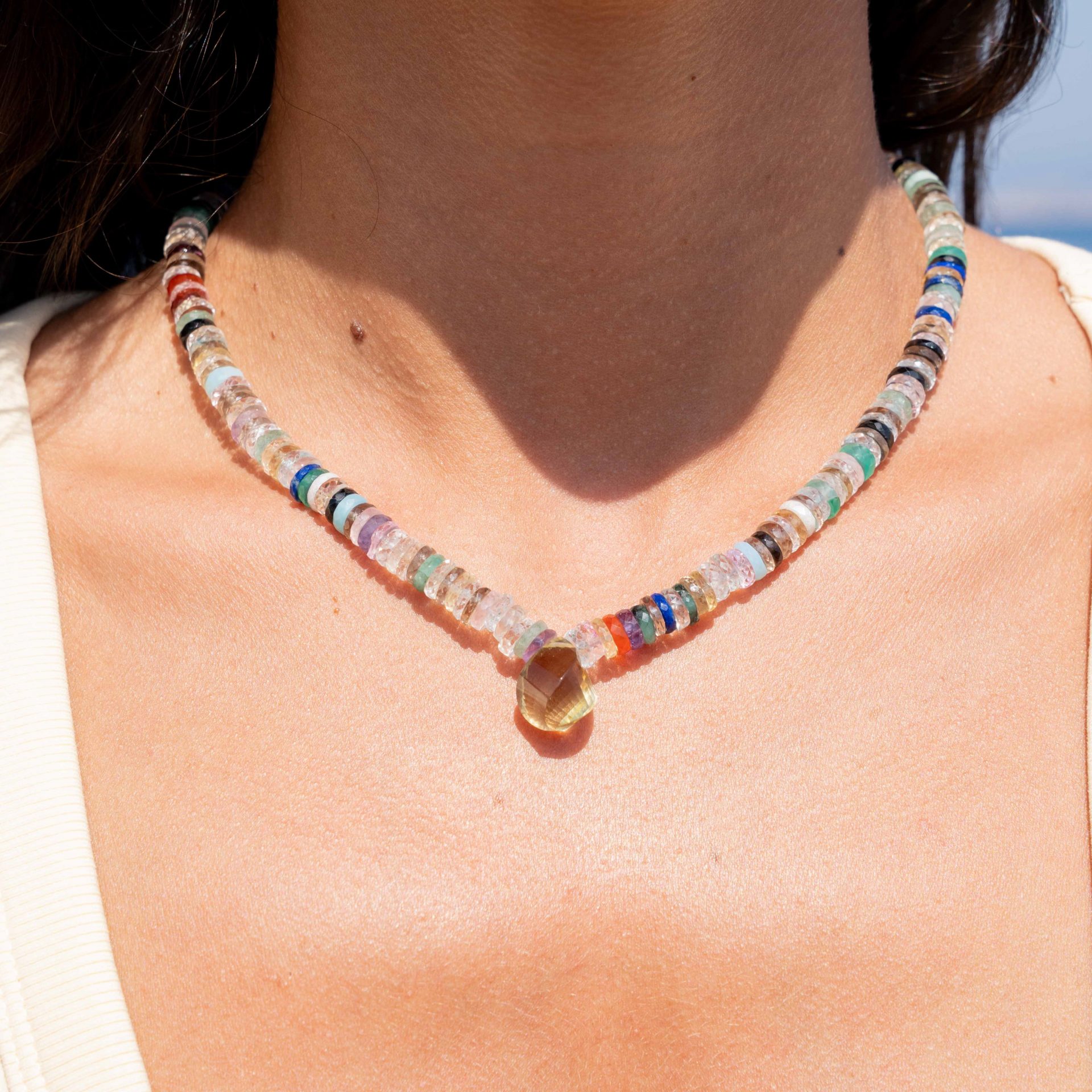 Composé de pierres précieuses multicolores, il s’illumine au centre d’une spectaculaire goutte en lemon quartz facetté, dont l’éclat doré capte chaque rayon.
