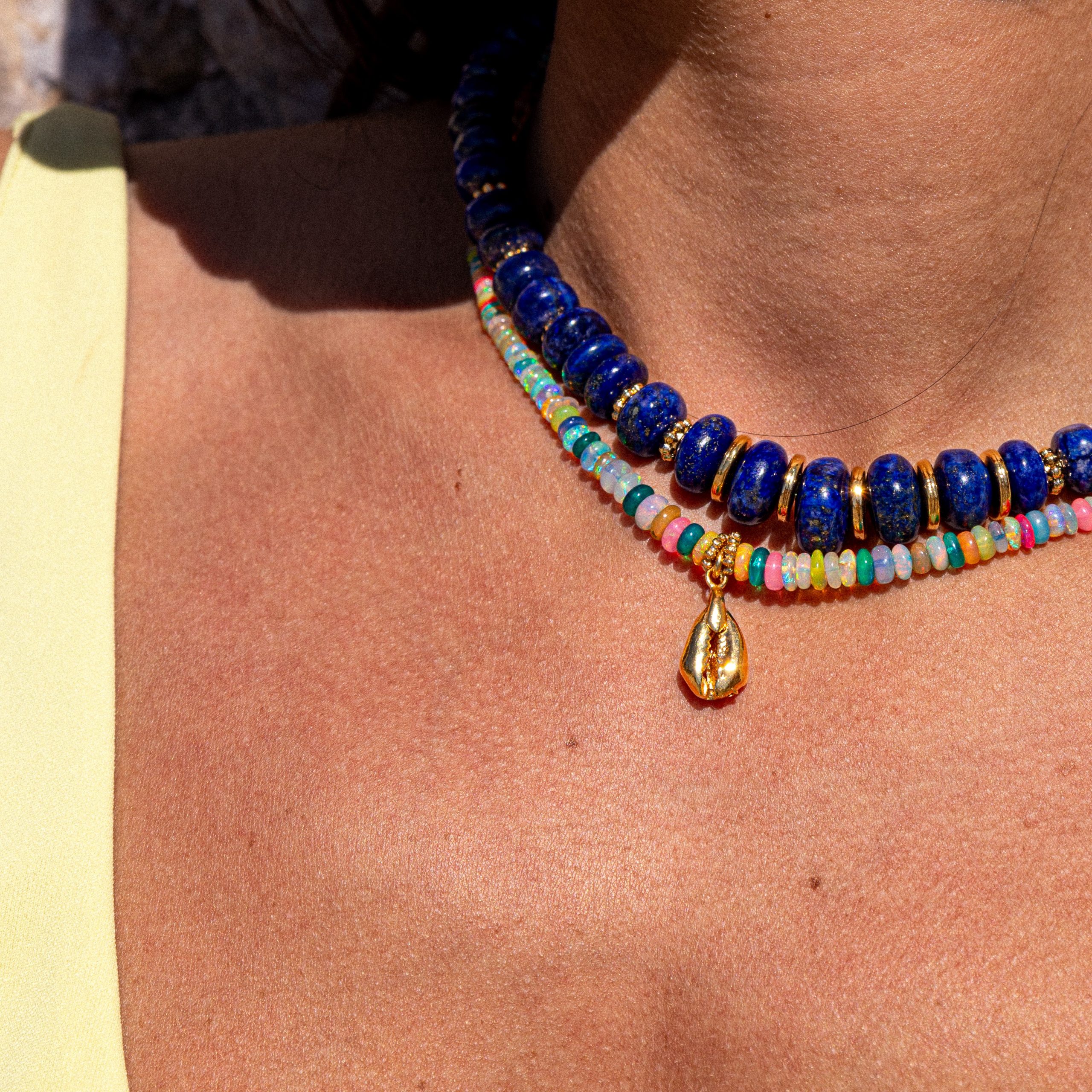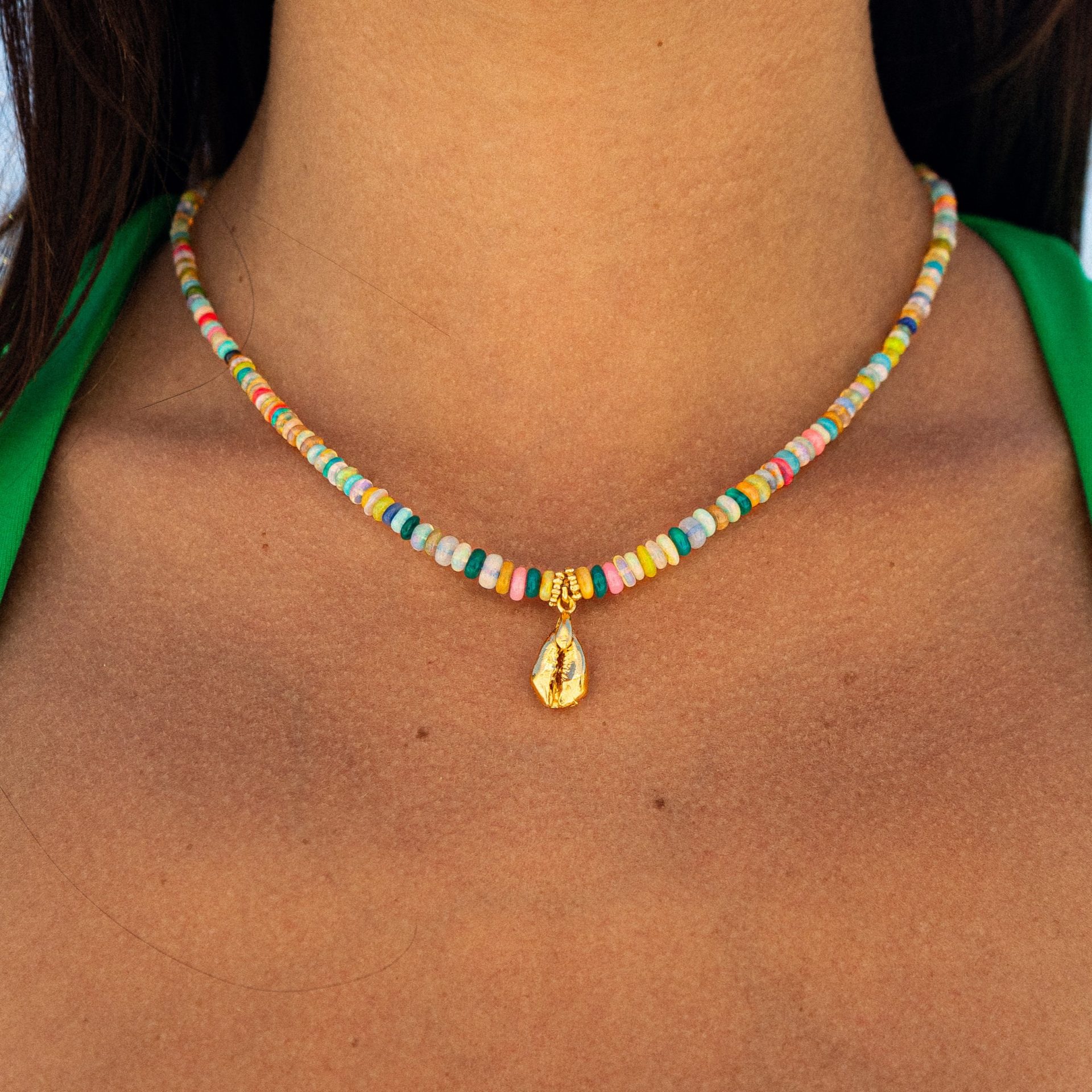 Collier en opale multicolore orné d’un cauri doré au centre.